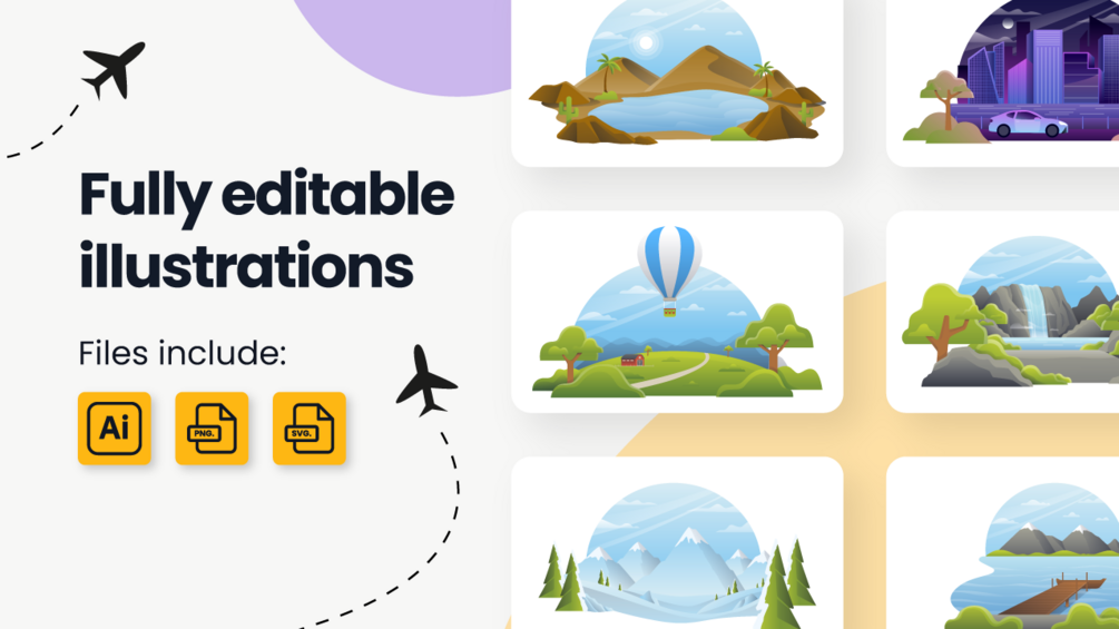 This pack comes with 7 unique illustrations with black and white and colored versions for each scene that are truly breathtaking for any project.