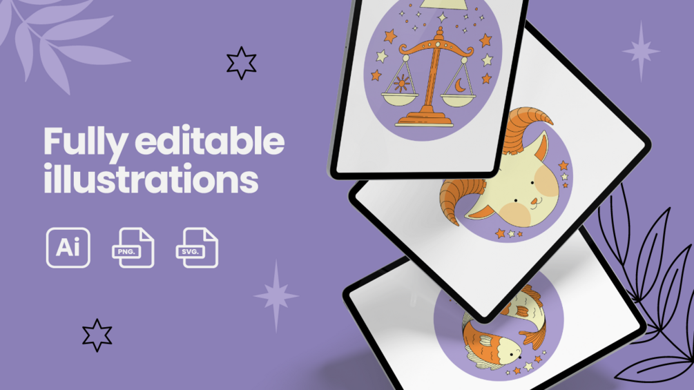 Introducing our captivating Horoscope Illustration Pack! Immerse yourself in a celestial journey through the zodiac with this enchanting collection of beautifully crafted astrological artworks. Each illustration embodies the unique essence of every zodiac sign, combining vibrant colors, intricate details, and a touch of magic. Whether you're an avid horoscope reader, a lover of astrology, or simply drawn to the mystique of the stars, these illustrations will bring your cosmic dreams to life. From fiery Aries to dreamy Pisces, let the Horoscope Illustration Pack transport you to a world where the alignment of the planets sparks inspiration and ignites your imagination.