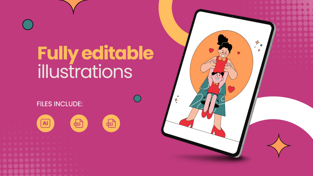 The Mother's Day illustration pack is a collection of beautifully designed graphics and images that celebrate the love, care, and sacrifices of all the amazing mothers out there. The pack includes a range of illustrations, from colorful flower bouquets to heartwarming family portraits, all of which capture the essence of this special day.